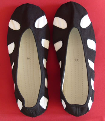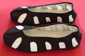 十方鞋:鞋口圆,鞋帮为黑白相间的条形图案。是道教道士们日常穿用的布鞋。来馆太极养生学员喜欢穿此鞋练功,陈师行师傅更是一年四季穿此鞋。轮胎鞋底,非常牢固,优点是轻灵,古朴,无汗,无味。