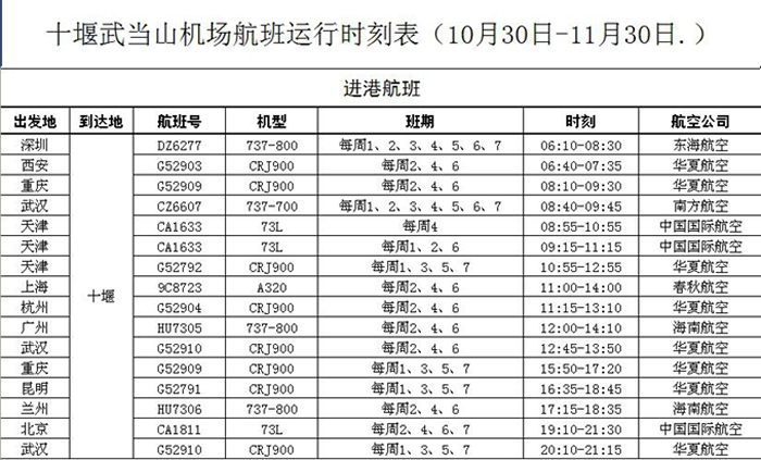 记者从武当山机场获悉,10月30日—11月30日,武当山机场航班运行时刻将有所变化,部分航线调整。