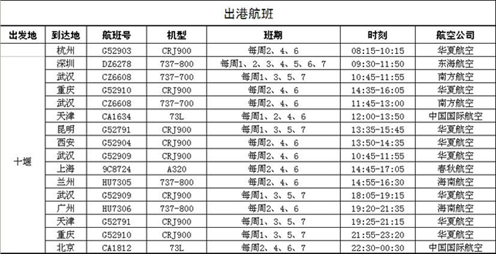 广州—十堰航班起飞时间由09:50—11:50变为12:00—14:10,十堰返程时间由18:00—20:10变为19:20—21:35。
