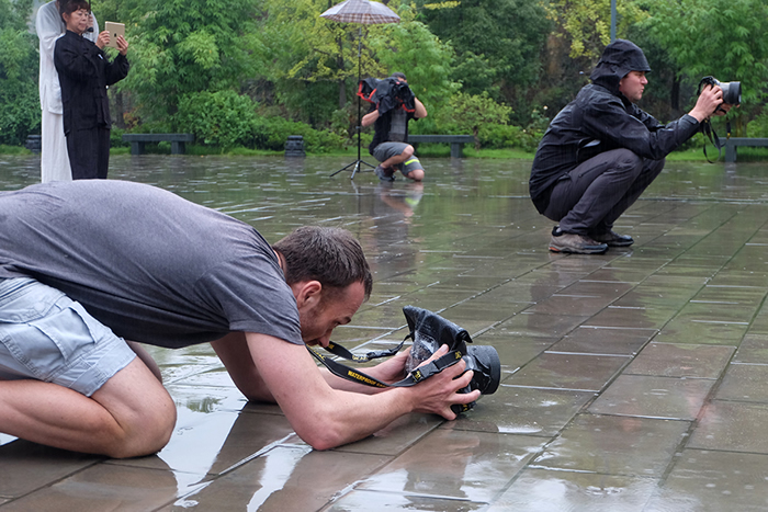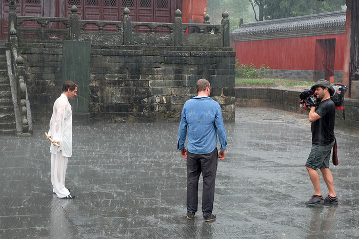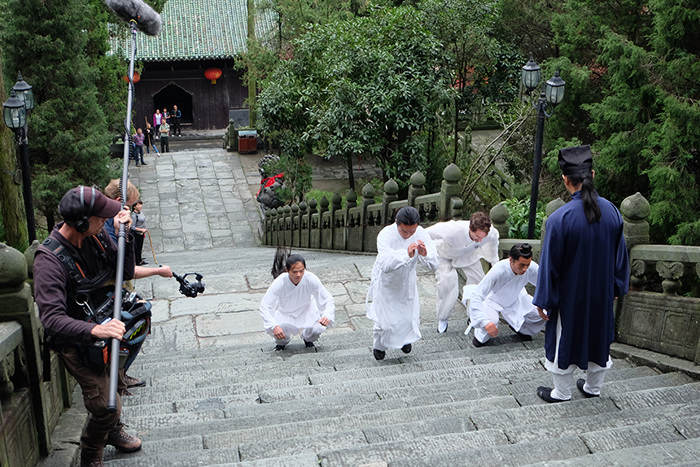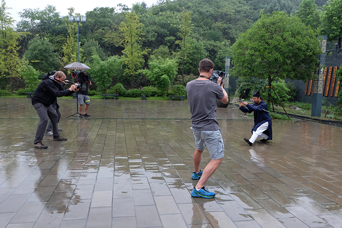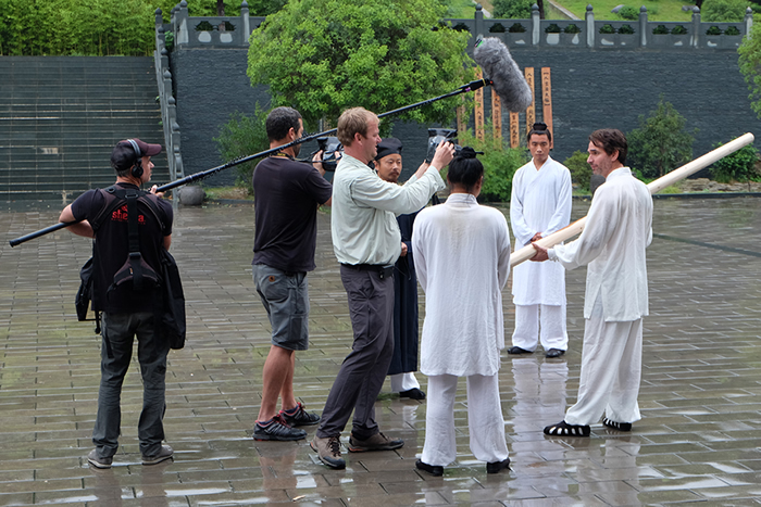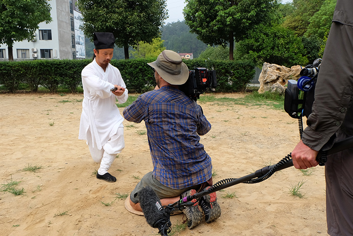 上武当山金顶拍摄时,遇上雨雾天气,摄制组扛着17箱器材上山下山,为了选取最佳拍摄角度,他们或者趴在石阶上,或者要爬到崖壁之上,并对此毫不在意。给所有拍摄机器都装上了防雨套,但自己却跟武馆弟子一样冒雨工作。除了对拍摄如此,在师行武馆期间,每个人都十分注意遵循道家的文化礼仪,在馆中遇到学员都微笑示意。从他们身上,我们看到的是来自国际媒体对武当功夫拍摄的专业与用心!