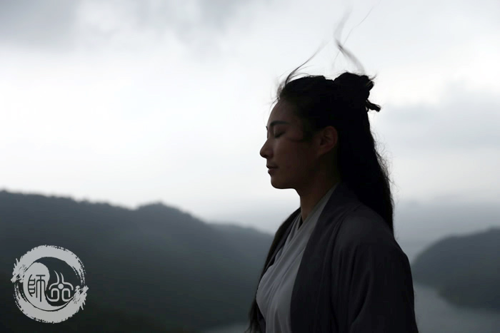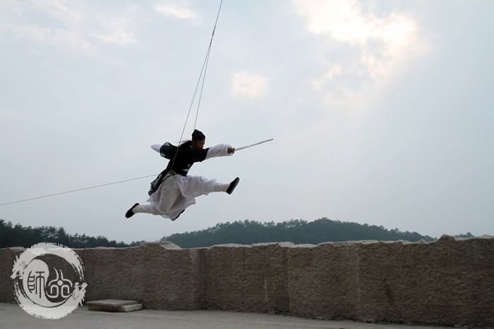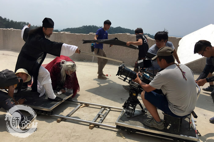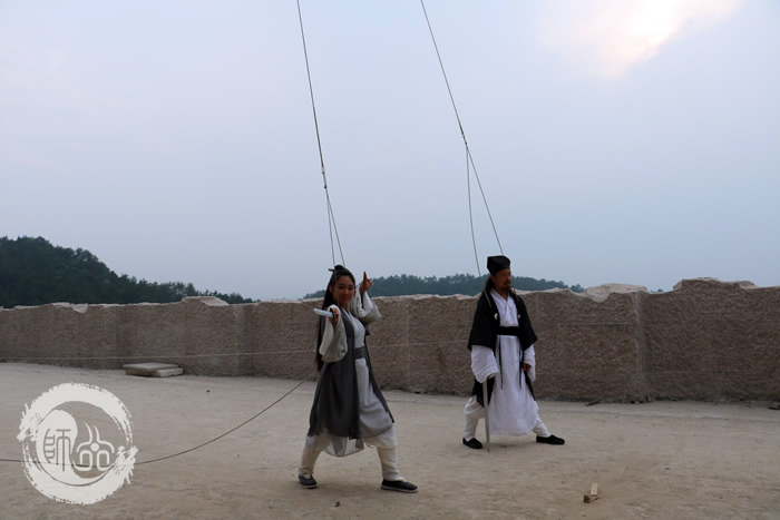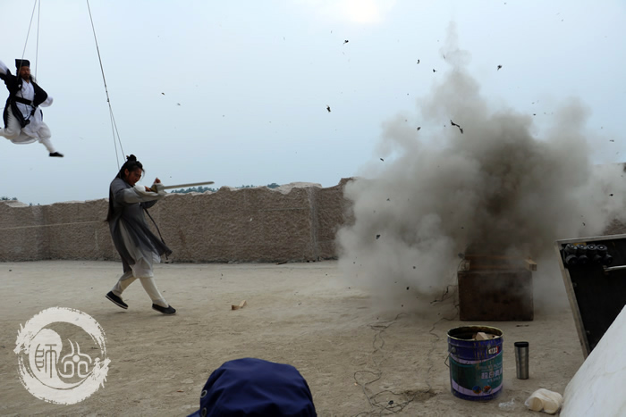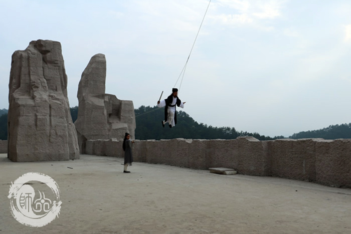 当日的太阳很炽烈,拍我们这场戏时已是中午11点了,山顶的气温达到37度。为了取景,我们搭梯子爬上4米多高仅容两人站脚的假山、又带着道具步行十层楼高的老子庙顶。每一个对峙的眼神、撩剑的动作、互动的走位,严谨的导演为精益求精,一遍一遍重复着。人工撒土制造灰尘、滑道、爆破、威亚等齐上阵,一个多小时爆晒下的重复动作和爆破引起的短暂耳聋后,我感觉已快要中暑虚脱,做起动作就很吃力,被导演批评了好几次。相反师父却一直淡定从容,很快就能领会导演讲述的场景,然后一边教我动作要领,一边凭真功夫自由发挥,导演甚至多次直接否定原先设定好的武术动作,而采用师父演示的剑法。