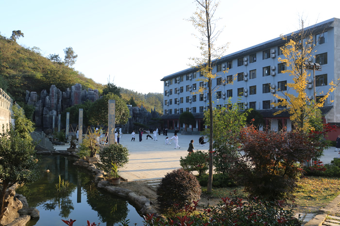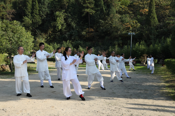 经大门前的朱漆铜柱,穿过青龙堂和白虎堂之间的内廊,一直沿阶而上,便踏上了功夫馆内第一道场太清台,只见一群肤色各异的外国学员在陈师行道长的指引下操练太极拳法。师行道长的太极心法有利学员更快更好的掌握太极拳核心要领。