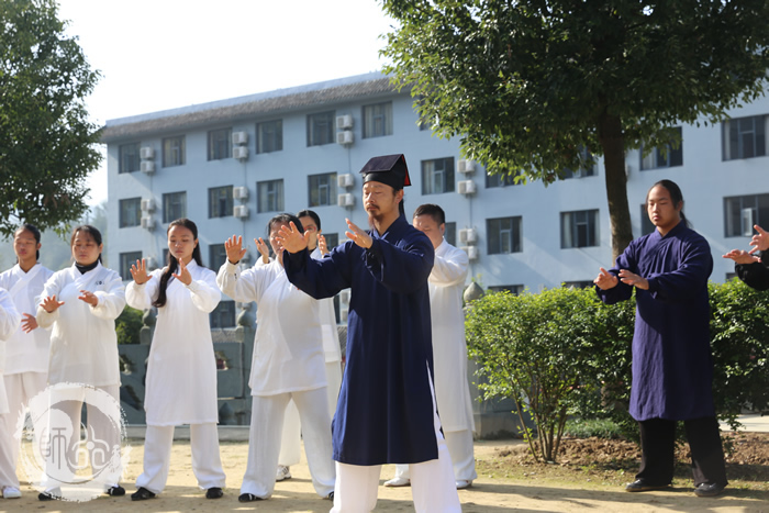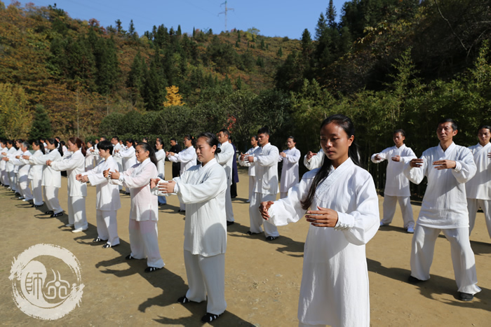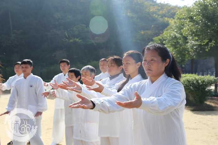 学员们经过论道堂一课,对武当武学和道家文化有了更深的认识。带着这份认知,学员们开始学习武当太极拳十三式。课程初期陈道长亲自教导学员们学习武当三盘功法以巩固上中下盘基础。等学员们熟练三盘功法之后,陈道长开始教授太极拳十三势套路、丹田聚气桩、太极引劲桩。此套路为无极、太极、两仪三者组成的拳系,每一个动作都含藏着深意或能运用于实战技击中。 例如:为了让学员更加了解分式手型要圆,道长现场邀请穿黑白练功夫的两位同学以分式手型相合,竟巧妙成阴阳和合的太极大圆。陈道长并进一步演示太极拳动作的技击涵义。
