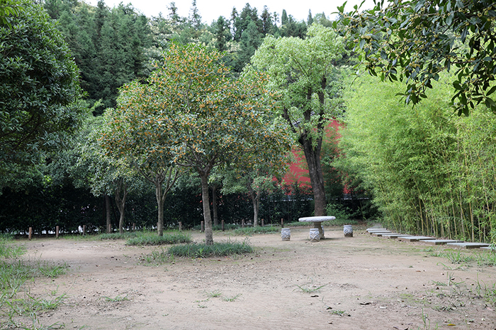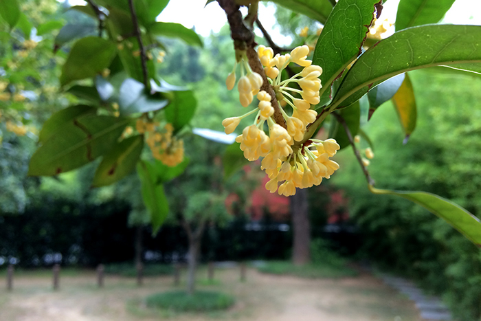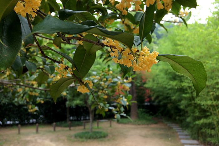 如果要问馆中最适宜赏桂识香的地方,那无疑要属上清台上的桂花园了。这里是馆中种植桂树最集中的地方。早上七八点,前来桂花园寻香,还未进入园中,就已先闻到桂香弥漫。顺着花香进入园中,一片浓绿之中,枝头万点黄花开,带着清晨的露水,清新的香气扑鼻而来。