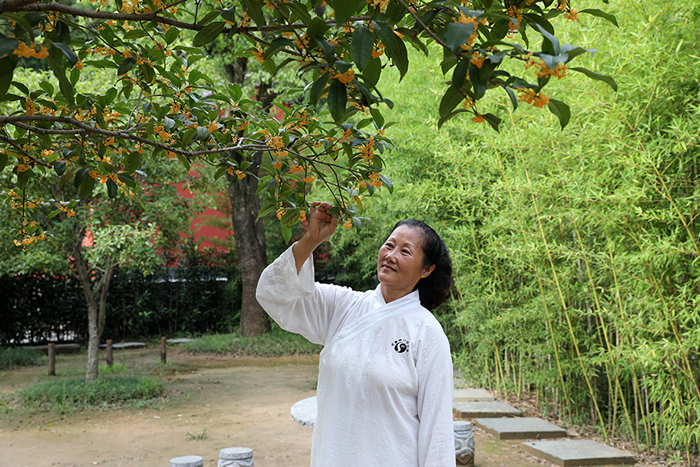 早起的学员已在桂花树下,开始练习太极十三势。一呼一吸间,吐出浊气,纳入清新的桂香。这不正是这个季节最好的养生方式吗?看着学员神态恬淡安静,随口问在这桂花园里练太极有什么不一样的感觉吗?她笑说,“闻着桂花香,心情好像都纾解了很多。最近睡眠都好很多,心神安宁,不知道是不是跟花香有关”。
