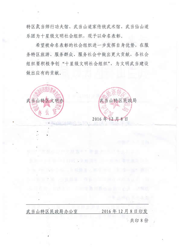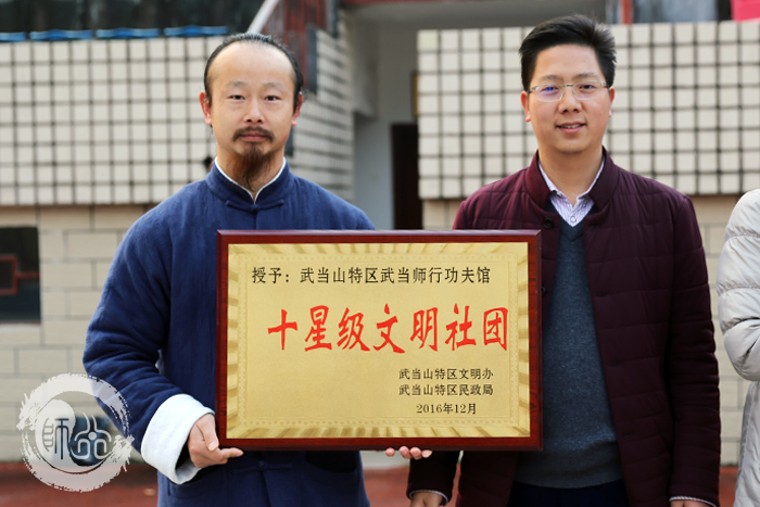 2016年12月23日上午9点,十堰市武当山特区十星级文明社会组织授牌仪式在武当山特区国术馆举行。2016年度十星级文明社会组织创建活动从7月中旬至12月底历时半年,通过自愿申请、对标创建、评审定星、公示等程序,武当师行功夫馆、武当山道家传统武术馆、武当道乐团三家单位被评定为“十星级文明社会组织”。特区文明办、特区民政局、特区文体新广局、特区武术局等相关领导出席并主持,获得该殊荣的相关单位负责人、员工及学员们参与了本次授牌仪式。