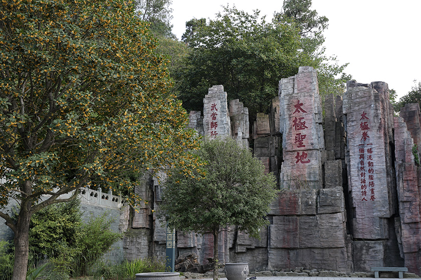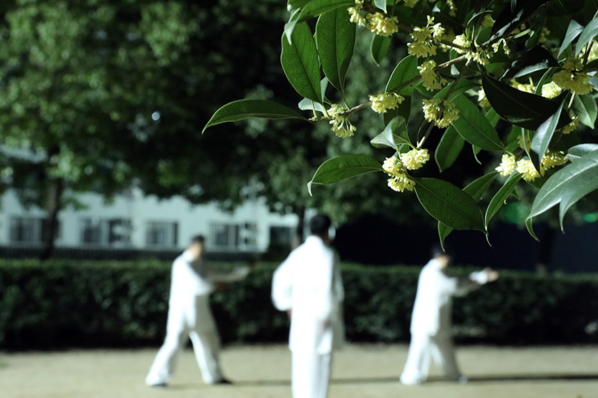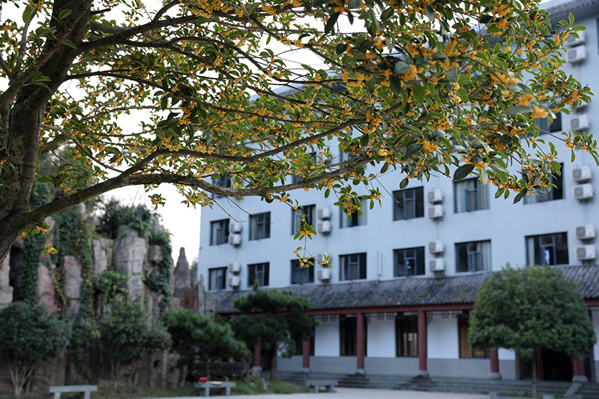 武当师行太极道院位于山谷之中,依山就势布局三层练功场,寓名“三清台”,并种植了六十余棵桂花树。此时节,无论走在哪一处,都有花香伴随,都有学员练习太极拳的身影。