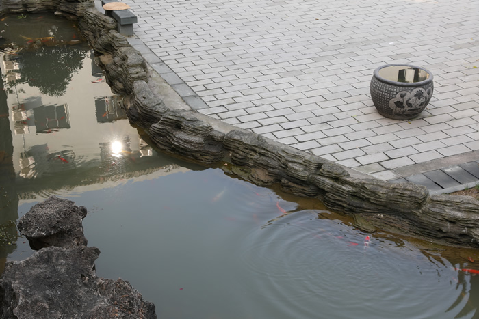 玄武池整体深达一人,或宽或窄,最宽处为太极碑下,也就是石玄武所在的位置,犹如蛇头。流经台阶的两段较窄。池水或深或浅,石玄武所在的位置,恰恰也是玄武池最浅的地方,但却是鱼儿最喜欢盘踞的地方。离开石玄武所在的一片最宽水域,卵石所砌一口很浅且窄,犹如水坝,但依然不时有大鱼小鱼游过进入玄武池的蛇腹位置。过了台阶,另一端的玄武池就如同蛇尾,在最末端有一处泄洪口,以防丰水期漫出,铁网封口,防止外来物种侵入。用一块石头作为泄洪开关,挡在铁网处。