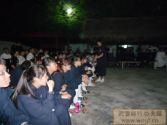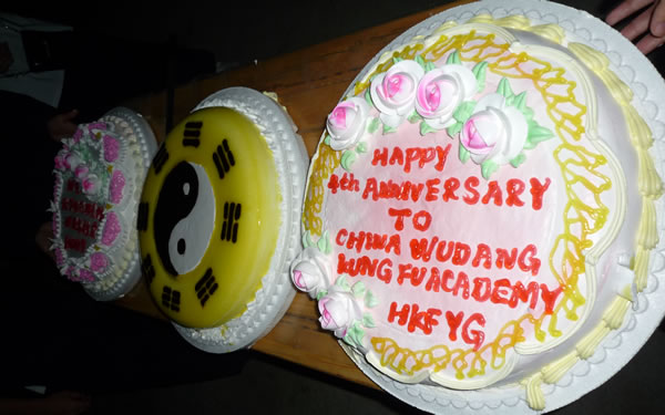 晚会上,大家不仅品尝着西瓜、鲜桃、花生和瓜子,在晚会接近尾声的时候,又品尝了香港青年协会特意向武当师行功夫馆献上的四岁华诞的生日蛋糕,大家尽情地歌唱、欢笑、交谈,其乐融融。随着“嗵、嗵”的巨大声响,绚丽的烟花撒向武馆上空,晚会在落下帷幕的时刻,欢庆的喜悦气氛到达了最高潮,大家共同祝福武当师行功夫馆的明天更灿烂!