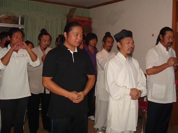 “世上无难事,只怕有心人。” 陈长虎(师希)、明平城(师微)、杨丽君(师衍)、张珊(师自)、顾世毅(师宁)五名学员,在近十年多的时间里,对三丰武术和道家文化孜孜以求,他们凭着一颗虔诚的心和坚持不懈的精神,通过了重重考核。今天,在这个可喜可贺的日子里,终于如愿以偿,正式成为武当三丰派第十五代弟子。