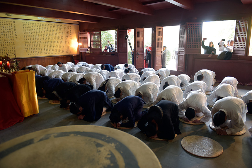 新弟子依次到坛前,恭对祖师虔诚拜礼,发宏愿。移位面对师尊,行三跪九叩礼。随着空灵深远的磬声响起,主持人说着叩首的寓意。“一叩首:尊师重道,众善奉行。二叩首:习武悟道,性命双修。三叩首:以武演道,德行天下。”随后弟子递交拜师帖,跪受师恩。