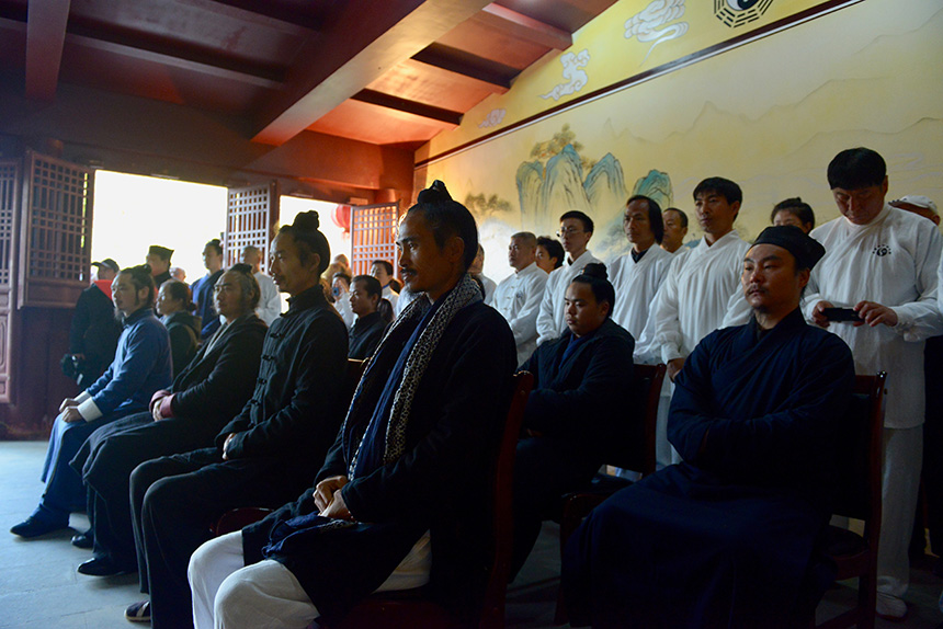 随着9点吉时到 ,三通鼓声响起,仪式正式开始。武当三丰派第十五代传人齐聚殿内,坛前焚香,恭请通微显化真人张三丰祖师及武当历代祖师鹤驾临坛以证盟誓,随后跪拜祖师,入右座。