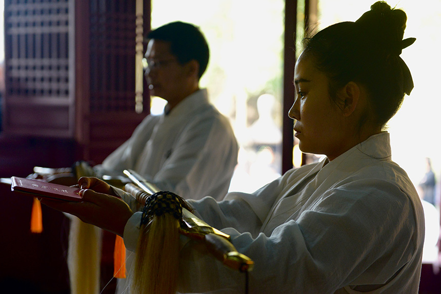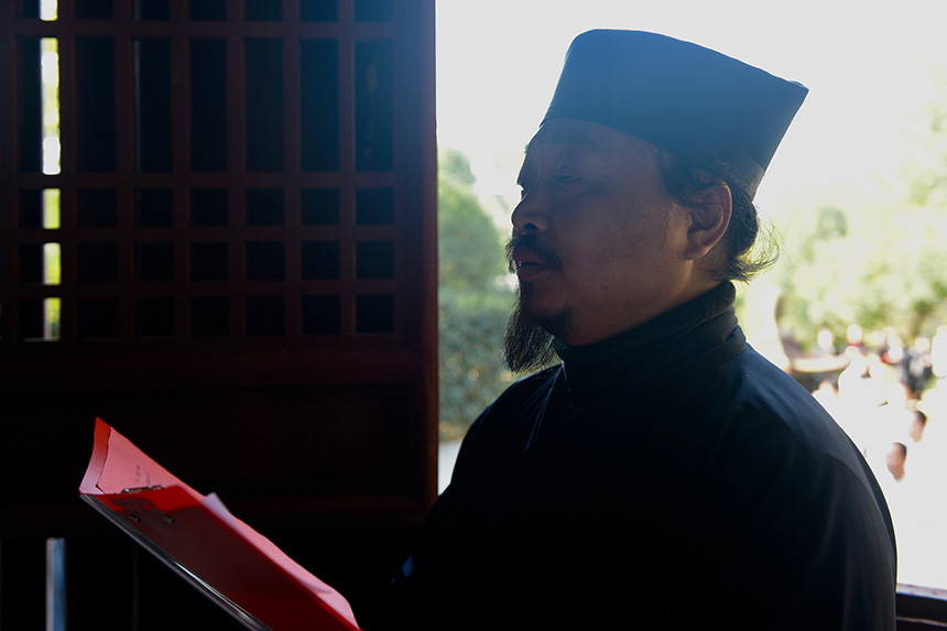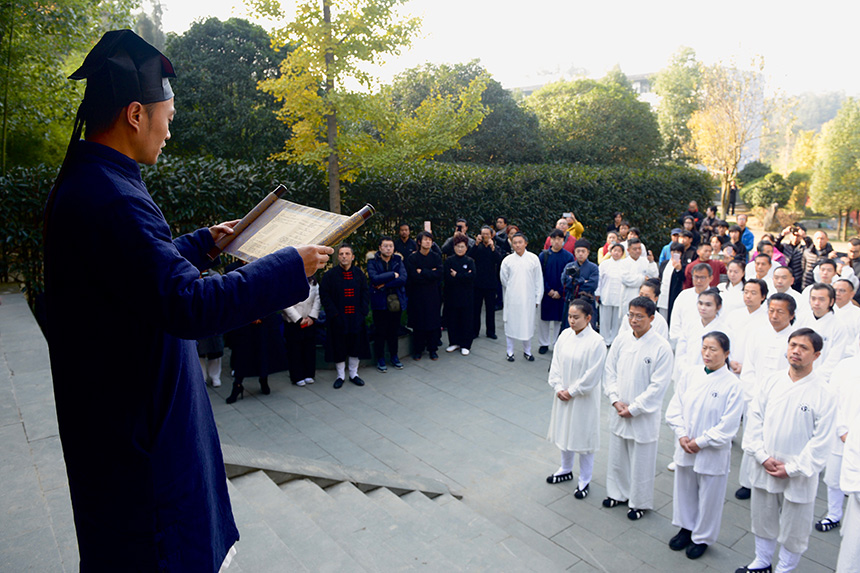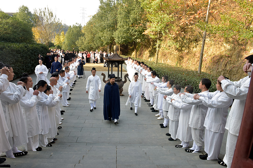 行拜师礼。主持人宣弟子登坛拜师,并宣读道号寓意。此次拜师弟子的道号,与前后道号衔接,连读成句,别有一番玄妙:“无极域空,常悟枯荣,地动神合,一炁轻松;吾在内,外兼修,筑灵炯,隐觅仙踪;庄周梦,齐物同化,逍遥游。”