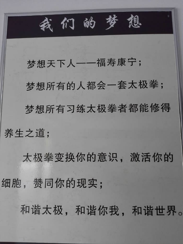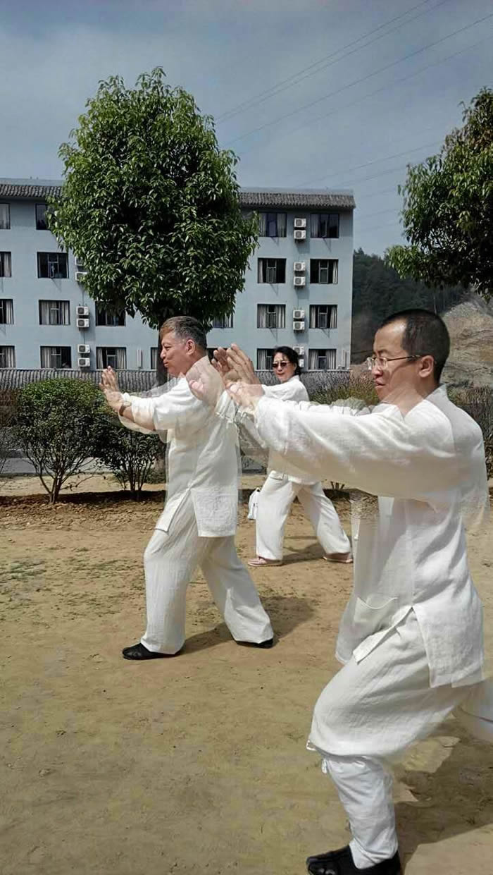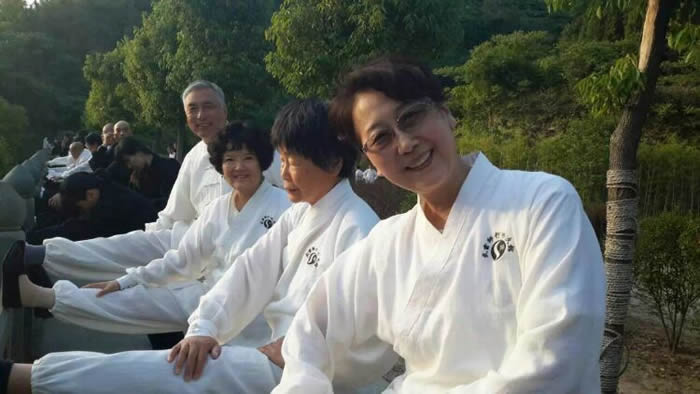 休息时间与胡老师交流。她告诉我们:这期广东的两位学员是因为他们的亲属患癌症后来此学太极拳调理效果显著而来的。还有一位年长者因高血压,糖尿病在此长期学习修炼病情得已控制。