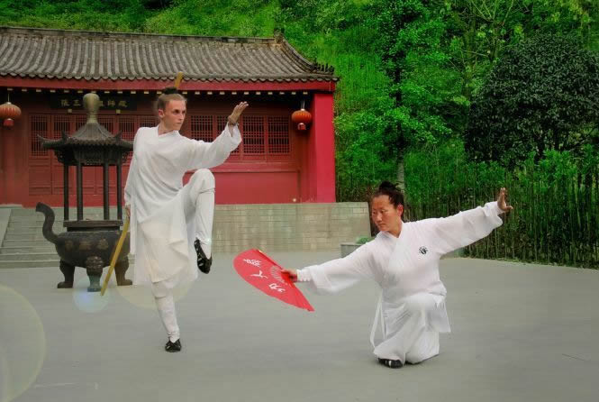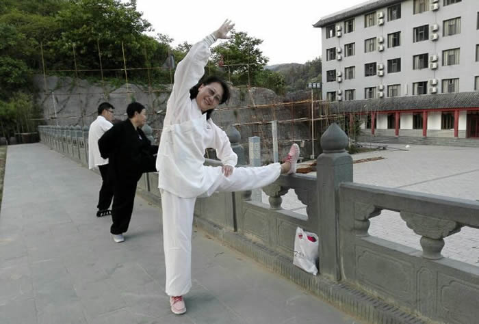 来这里学习的有不少外国人,他们崇尚中国功夫,学得也很好。我看到法国小伙帅气十足地舞剑耍棍;鹤发白须的韩国老汉(据说已70多岁了,常年在此修行五年有余)横劈叉;欧洲面孔的美女学剑……