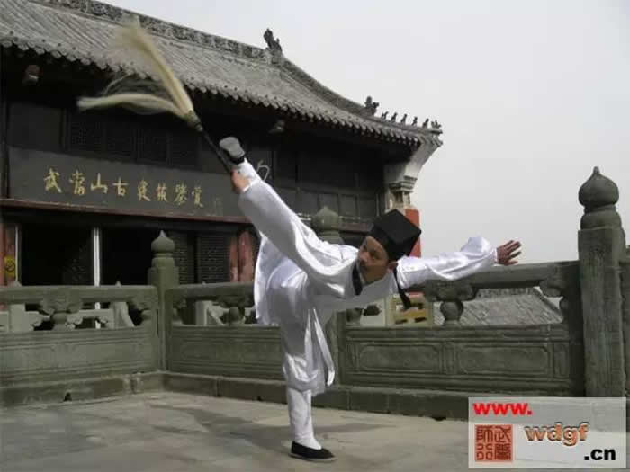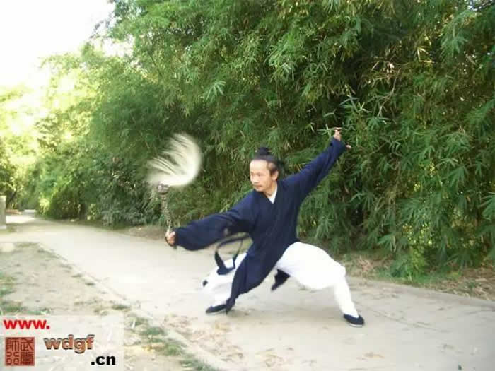 拂尘也是道派的一种有名的武器,在武当派武功中,有不少奇门兵器,拂尘即是其中一种,俗话说:“手拿拂尘不是凡人”,拂尘在道 门中有拂去尘缘超凡脱俗之意,也是道门中人们外出云游随身携带之物。在道教体系里,拂尘是道场中的一种法器,然后由道人将其又演变成兵器,属软兵器之类。