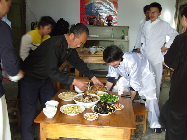 从驻地师行功夫馆到武当山脚下需要乘车,由师傅亲自带队,我们在修建了10年还未完工的盘山公路上驰骋,30多分钟的车程,只遇到1辆迎面而来的车,现在这条未完工的路上还人烟稀少,司机师傅轻车熟路,开得飞快,绝壁之缘,我们都提心吊胆,但考虑到他的丰富驾车经验,所以就少了份担忧。我们开玩笑:“车子开这么快,如果这么狭窄的路上迎面来了车怎么办?”,有师弟答曰:“我们都是练功的,可以用元气将迎面而来的车弹开…… 众人哈哈大笑,夹杂着香港话,澳式和美式英语,还有祖国大江南北的多种口味的普通话。