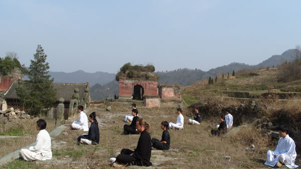 中午片刻休整后,下午3点,我们准时来到五龙宫内一大片空地上,刚好在这片废墟上有若干排列整齐的石墩,这石墩原本是大殿内粗壮的木架支柱的石墩,我们就每人坐上一个,开始打坐,在师傅的提示下,让心安静下来,在这个阳光灿烂的午后,有早春暖暖的微风,鸟语和暂露苞芽的花草植物的陪伴,让我们的身体和天地万物自然融合在一起,让自己彻底忘记一切,身心都放松下来吧!