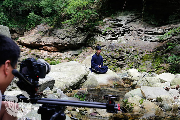 此次的摄影师相当敬业,由于选好的拍摄角度在水中,他二话不说直接卷起裤子蹲在湖里录制。拍摄轻功时,师父在带有青苔的石头上跳跃,最后一个落地时由于惯性太大,脚下无法生根,跳进河中。大家在惊吓中笑作一团,看着湿透的师父,我特别愧疚第一次做“助理”没经验,忘记多备几套衣服带上。