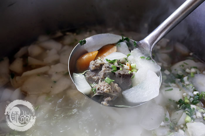 前行至灶炉旁,看到大厨正在用汤匙往汤锅内撒葱花,迎面扑来一阵让人垂涎欲滴的香味。看着我们的疑问,大厨轻描淡写地说:“萝卜牛骨汤,从早饭后用小火慢炖近4个小时。”轻轻喝一口,唇齿留香,牛骨上的肉细腻软糯,一咬就碎。牛骨和萝卜的味道丰满地融合在一起,满口都是时间的味道!
