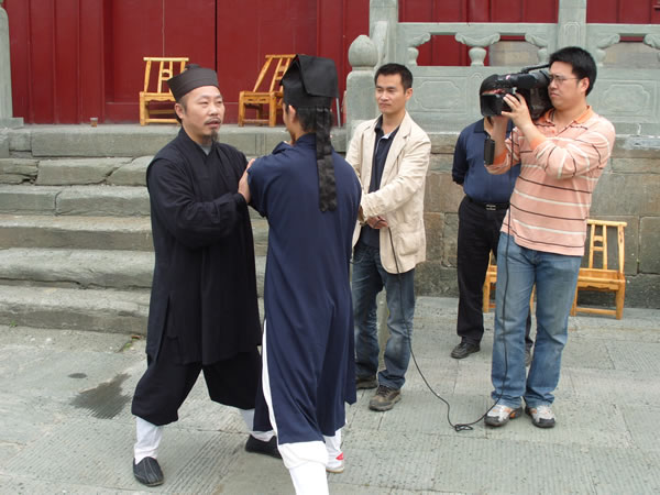 图为师爷钟云龙道长与师傅为湖北电视台演示并讲解太极推手。