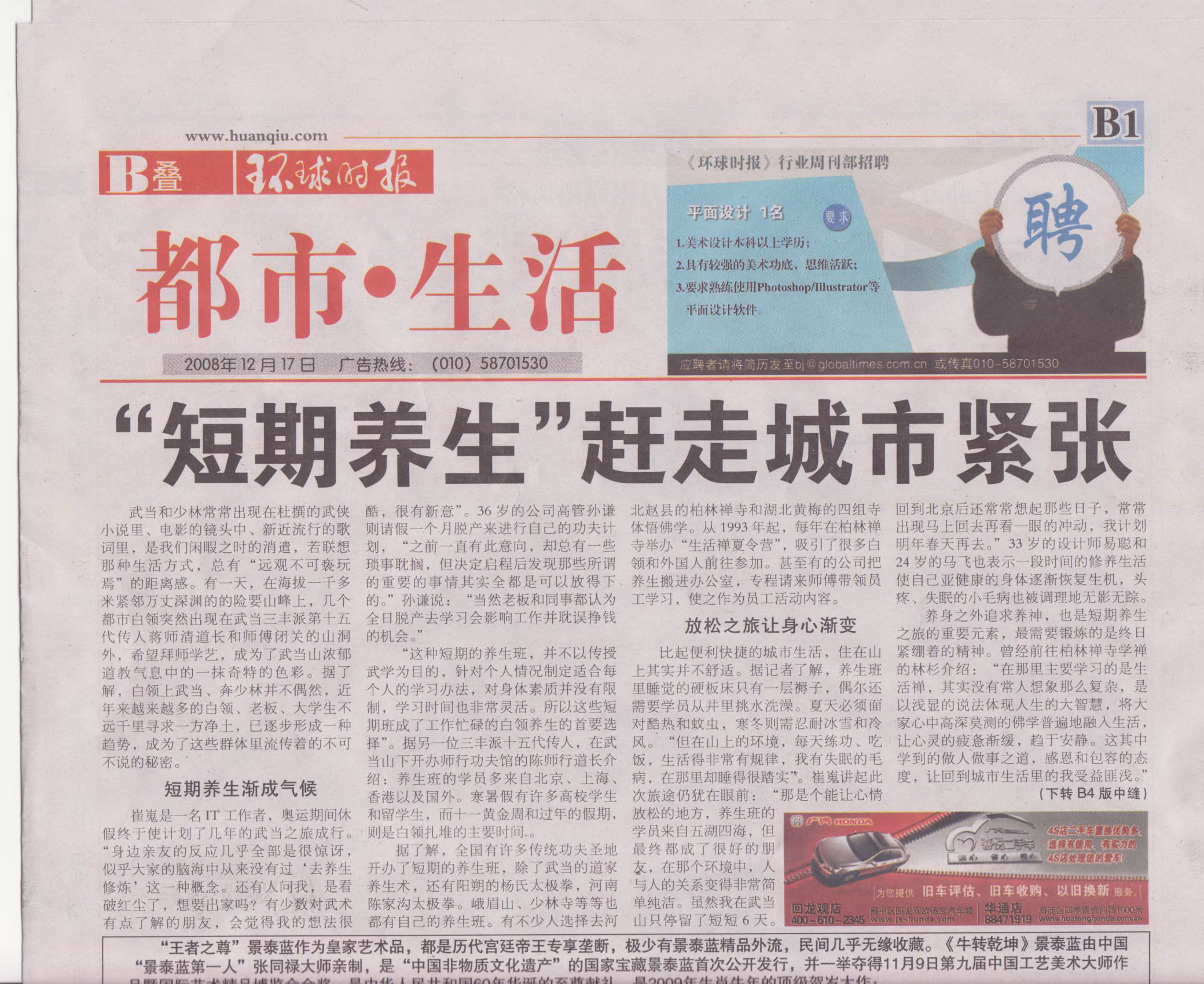 2008年12月环球时报对陈师行道长及本馆养生班学员进行电话采访