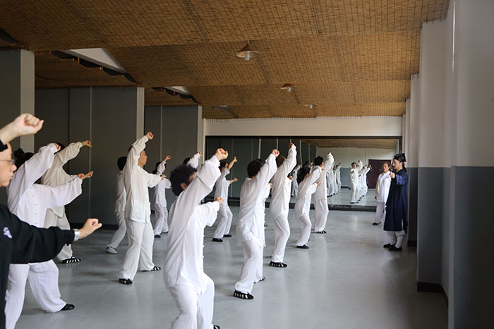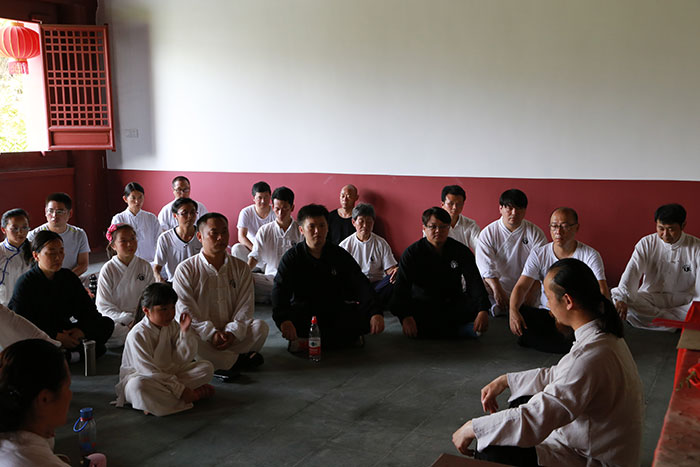 来到武当师行武馆上的第一堂课,就是论道。陈道长侃侃而谈,从道家哲学思想诠释了道的理念,太极寻求内心的清净,从内到外,回归自然,关键在自我。从意、形、劲、气、神的太极要领;到细、匀、深、长呼吸方式,从气到功,先天之气到后天之气,从静中而来,追求天人合一的境界。真是“一幅流动的阴阳画卷,一个与自然对话的诗人”。