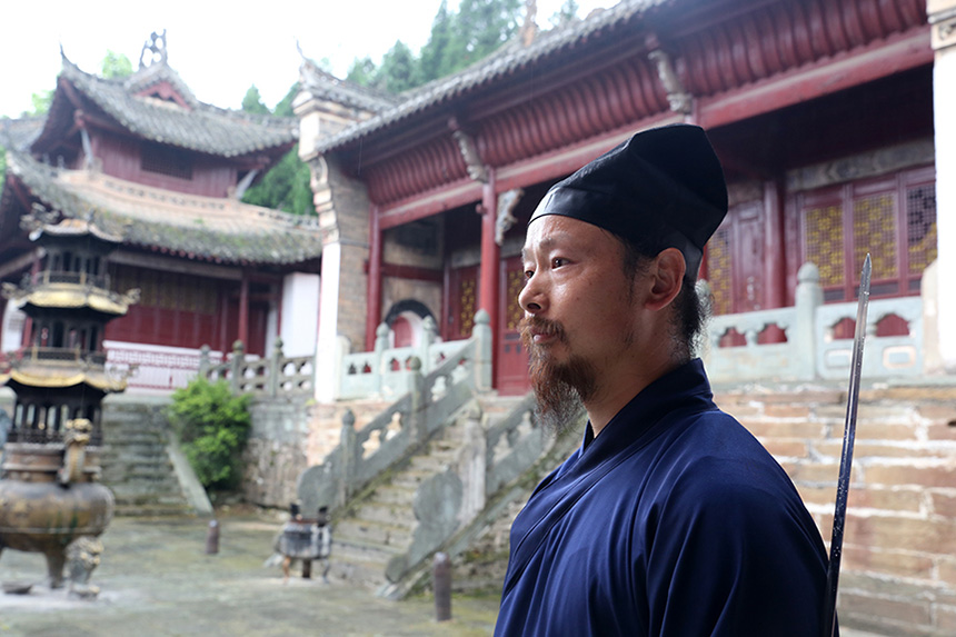 第一次认识他,是在腾讯视频里:剑回抽,扣左脚,撇右腿,体右转,剑由下向上架于头右外侧,与眉齐肩……短短一分半钟的七星剑片段中,他影随剑动,快时矫若飞龙,慢时似水波荡漾。我抱着怀疑的态度,一度认为后期用快慢镜头做了处理。结果怀疑的第三天我就见到了师行道长本人,这个武当剑的世界冠军!他一脸认真地跟我说:"没有后期,这是一气呵成,一遍完成的!哦,这可能是你做为媒体人的第一反映!"反驳完,还不忘给我找个台阶下。我在心里轻笑,平日里习惯了敷衍的微笑和交谈,这里每个人诚恳的认真脸让我觉得有一丝意外,上午的彭老师如此,现在的师行道长也如此……