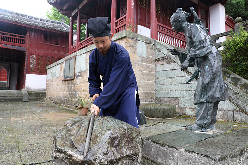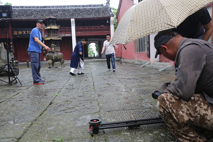 我开始在心里肃然起敬,如果没有他这样执着的信念,那我华夏数千年的道教文化会不会终有一日走上销声匿迹的窘境?道长押一口茶,继续拍摄当日的话题:"那日是与天有缘份的,我们刚刚到达磨针井,摄制组还在架设备、调灯光,灰蒙的天空下起细雨,如烟如雾,湿了琉璃顶,湿了磨针杵,目光轻抚,看到它仍如二十年前那般静静地立在那儿。我抬头沐雨,此刻雨滴成了玉清圣祖紫玄君对我的点化,他说'雨是磨针的水,而针是手中的剑'。随着领悟我手腕翻转,剑身划破雨布,剑尖刺破水线,那场景与铁杵磨针时飞溅起水珠何其相似!铁杵磨针贯穿于武学和做人之道上的精神远远大于想象,原来普及道家传统文化的责任一直是插在我心头激励我前行的那根针。当时整个摄制组被这天成之境所感动,随着收剑立定,周围一片沉寂,众人似是悟到我所悟,良久才爆发出一片热烈的掌声。"