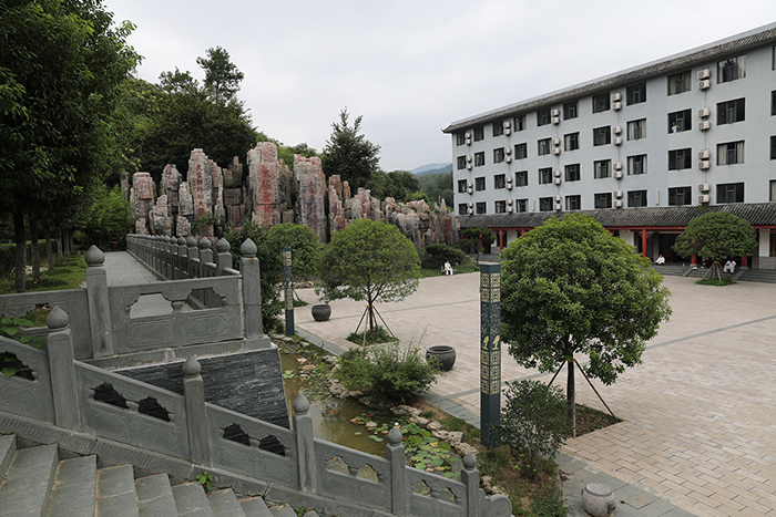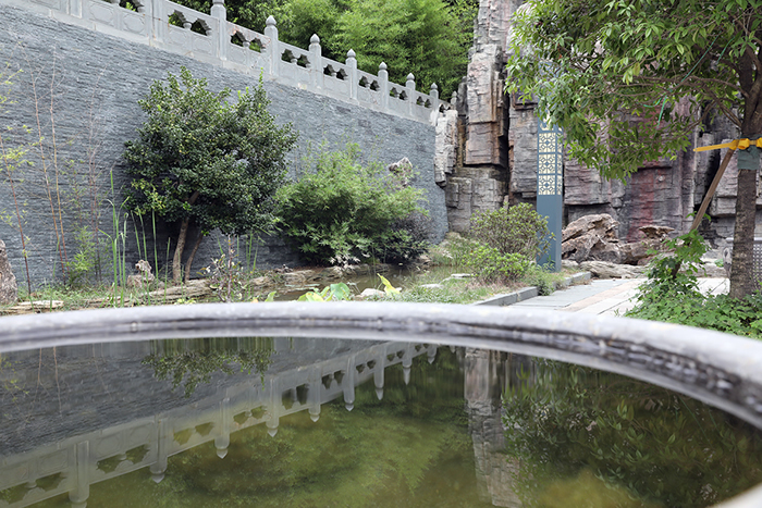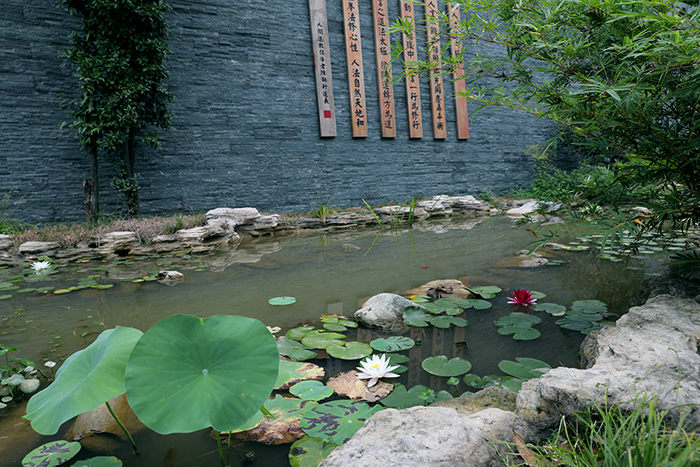 此时的太清台练功场,地面微湿,空寂无人。伴着琴声,独自来看一看雨过之后师行武馆的一景一台。刚一走近悟道池边,就惊扰了正在吃食的鱼群。听到岸边脚步声鱼群机敏的躲藏到了荷叶之下。睡莲开了满池,有白的、有黄的,有粉的,每朵花瓣上都带着雨露,在这一池道水中出落得亭亭玉立、楚楚动人,宛如冰肌脱俗的少女。
