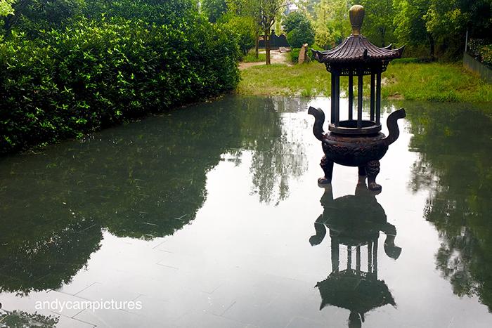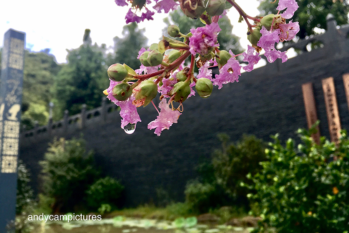 沿着悟道池继续走,几枝紫薇花因为茂盛而被压弯了花枝,花尖出仍挂着水滴,凝而不坠,倒映着一个晶莹的世界。地面上,一夜风雨过后,飘落了满地的碎花,沾着雨水,倒也别有一番韵味。