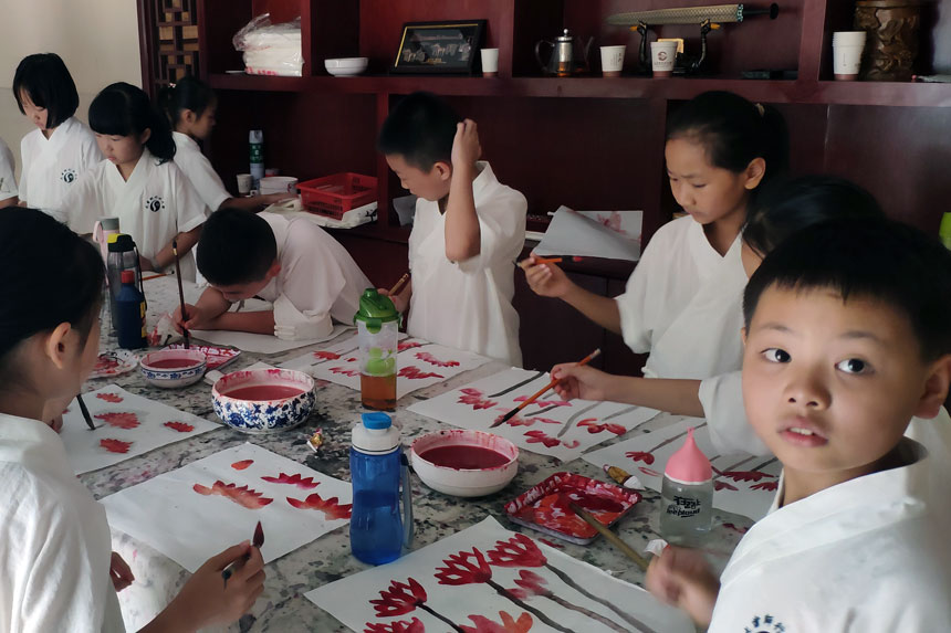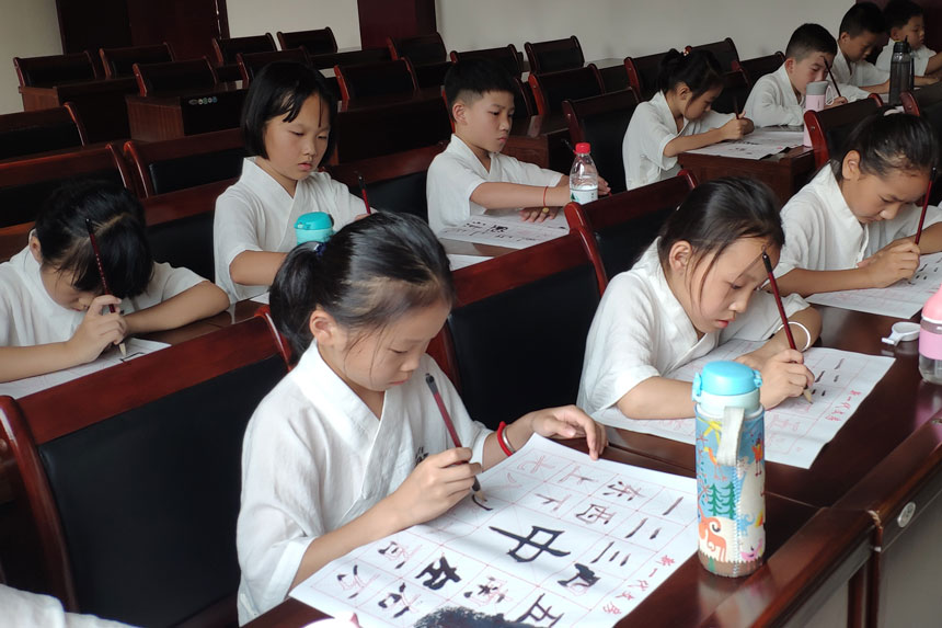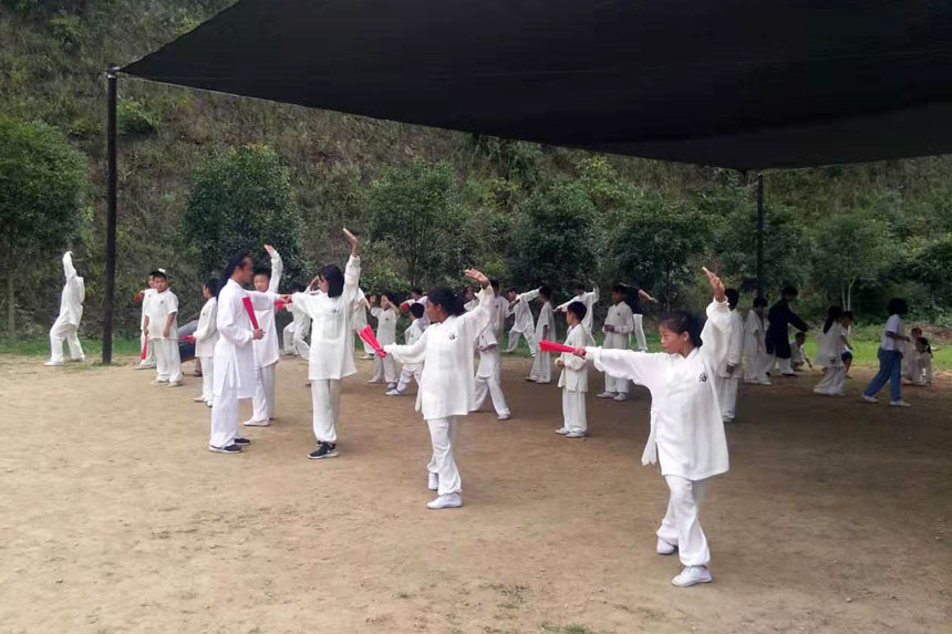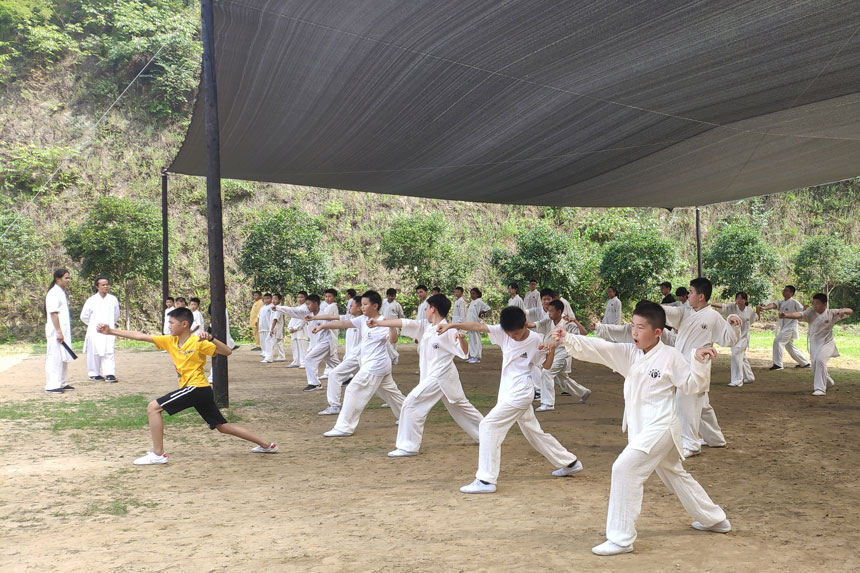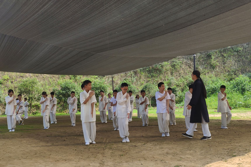 练功场虫鸣阵阵,不绝于耳。孩子们尽管热得流汗,但是始终听从教练指挥,时而屈膝,时而展臂,时而踢腿,时而挥拳,一招一式学得有模有样。远远望去,场面整齐划一,煞是好看。
