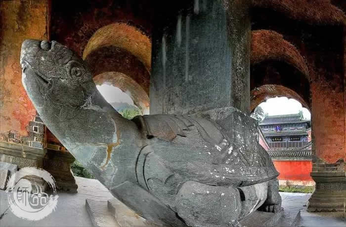 武当山紫霄宫大殿后蹲着的龟蛇二将,传说是真武大帝肚子和肠子变的。碗粗的蛇将军,紧紧缠着龟将军的身子,龟将军的脑袋放在一边,伸着的脖子里“咕咕噜噜”一个劲地吐水……