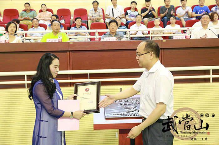 武当山特区工委委员、组织部长师文明向武术标准化赞助商颁发荣誉证书
