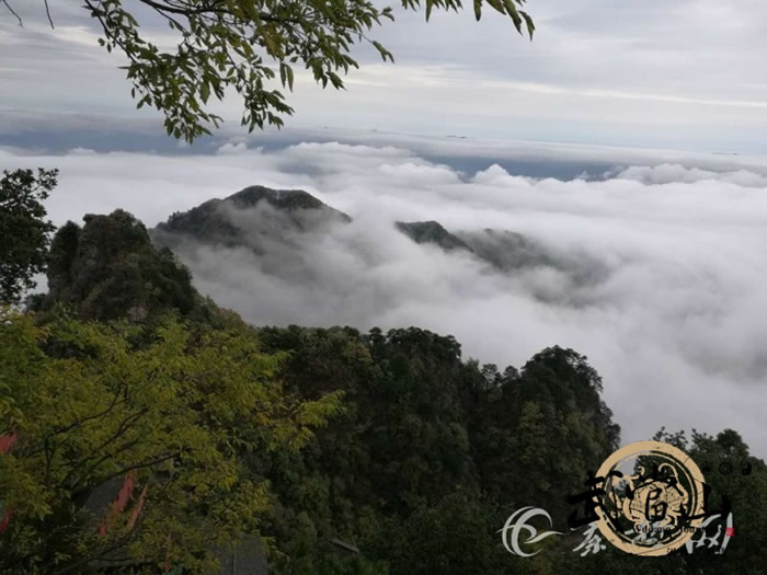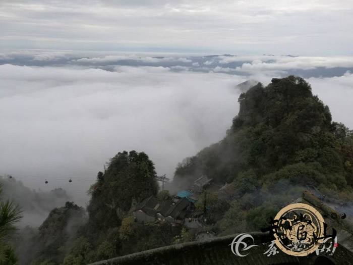 10月30日上午,告别连日的阴雨朦胧和雪粒飘飘,武当山雪后放晴,金顶出现美轮美奂的云海奇观。被红叶装点的武当仙山,在云蒸霞蔚之间更显色彩斑斓,恍若仙境,令海内外游客无不陶醉其中。