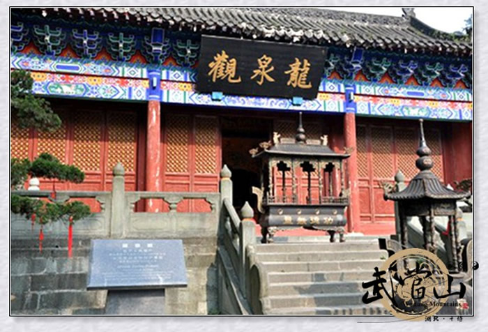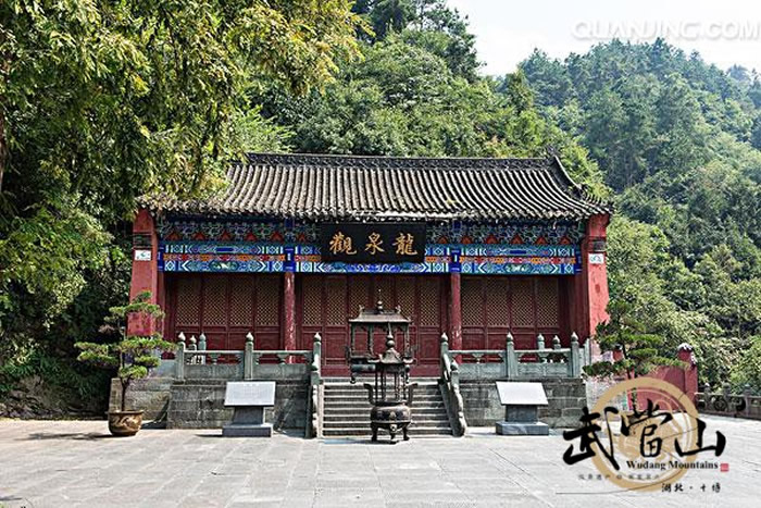 在武当山剑河桥一端,倚峰临涧而卧一古建筑,砖木结构,玲珑精巧,殿前一方石墁地院落,周围饰以石栏,在翠松绿竹之中,更显幽静雅致,这就是在原址上修建的武当山龙泉观。