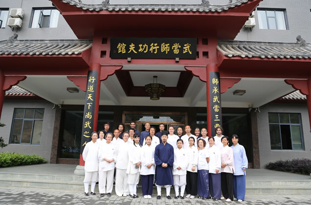 在青山绿水中一路辗转,终于抵达目的地——武当师行功夫馆。一下车即被武馆的建筑所吸引:大门黛瓦铺陈、飞檐映天,“师承武当三丰正宗,行道天下尚武之人”, 一幅笔墨苍劲的楹联拱辰着“武当师行功夫馆”醒目的匾额……很传统的感觉,不愧为武当三丰嫡传正宗。