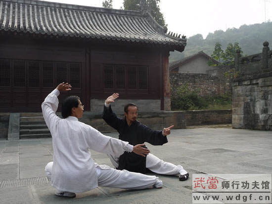 10月3日上午,秋高气爽。元和观练功场的三进庭院更加显得典雅而幽静,武当师行功夫馆馆长陈师行道长带领着养生班学员们正在习练养生功法。碧绿的山坡上不时飘来柑橘和桂花的清香,此时此景,学员们无不感到神清而惬意。