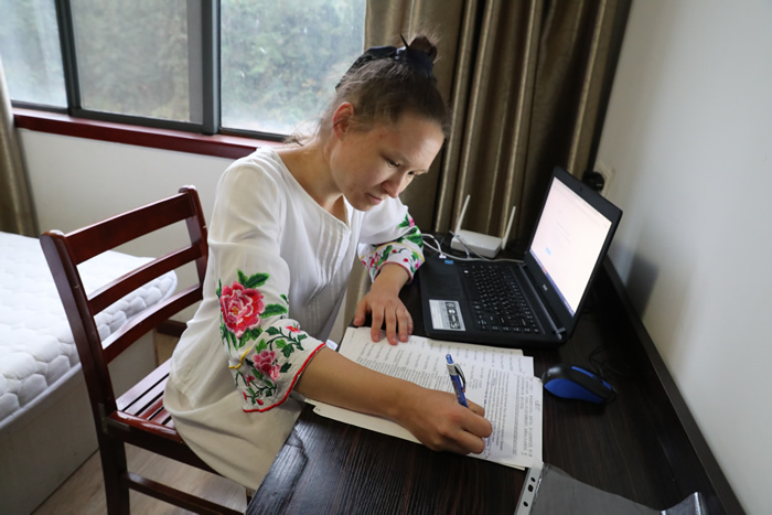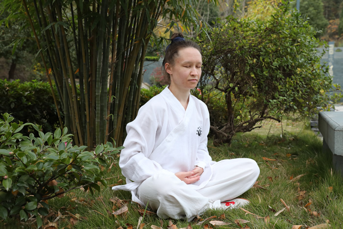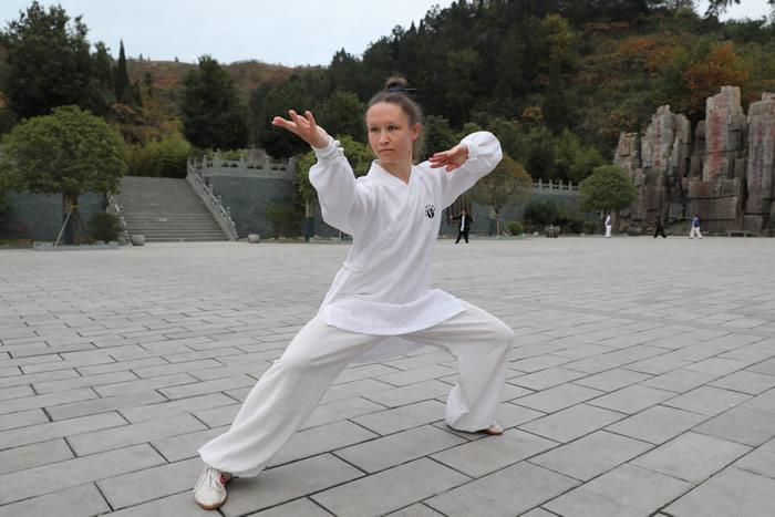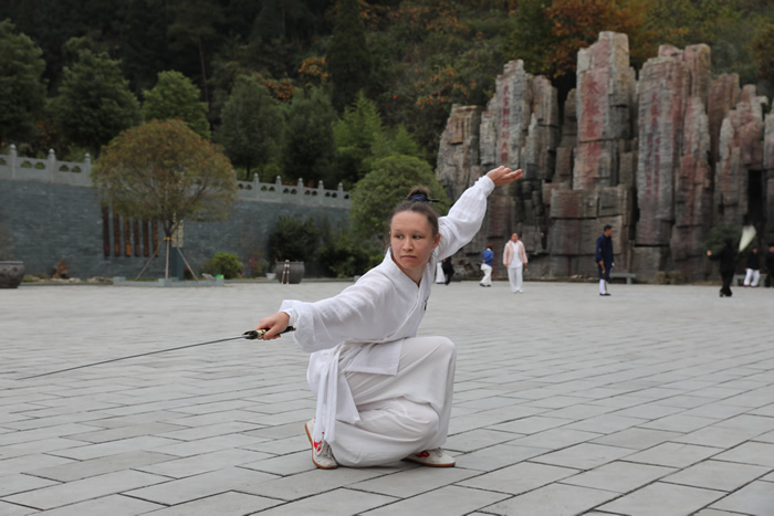 第一次遇见她是在晚课后,一个扎着传统道士牛心发缵的白皮肤蓝眼睛的外国女孩在专心的练功,此情此景不免让人倍感神奇,待她回屋之前,便随便攀谈了几句。第二天再次在宿舍走廊遇到她,终于使她打开了话匣子。出生于圣彼得堡的Anna,从小就很是另类,而且自己在家乡很少有人能理解她,和她有共同的爱好,言语间英语与中文夹杂着的她笑谈自己虽然说的是俄语,但是他们却听不懂。虽然和大部分外国人一样,对中国武术的第一印象也是因电影结缘,但是却有些不同:她的中国功夫电影第一印象是上世纪70年代的邵氏集团出品,而她最喜欢的功夫片演员居然是老派动作影星刘家良。这些名字对于许多出生于90年代的现代年轻中国人而言,都已经深感陌生了,可见她与中国文化结缘所深。