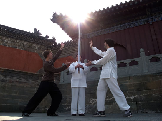 自古中国就有尊师重道之说,在学生们上课之时都很尊重道长,道长总是待人谦和却严以律己,临别之时他展示了轻功“飞身鞭腿踢瓶”,前几次没做好,一定要再来一次,直到动作完美才罢休,可见传承的坚忍不拔,不屈不挠的武当精神。武当太极讲究周身上下相随,自然协调一致,呼吸自然匀柔,以意导气,以气引劲,以内气催外形身法中正沉稳,劲力内含,因而显得大气不凡,韵味十足,颇具仙风道骨之风范,实为中华太极之瑰宝。