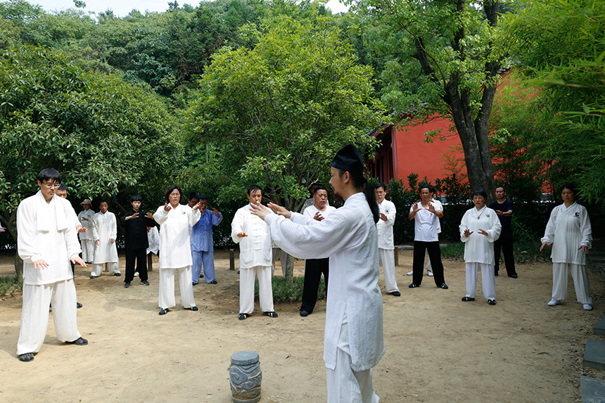 “你们要悟拳,心中要有问题,说出来,看会不会考到我。” 新一期的亲授班学员正在向师行道长学拳。