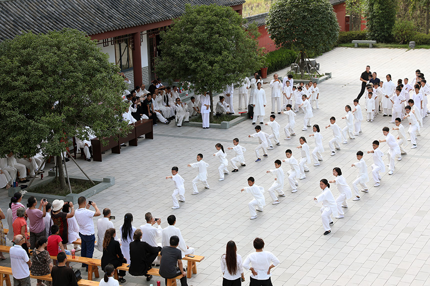 今年我们将遮阳棚搭在玉清台最上面,这是一个藏风聚气的风口,温度要比外面低七度到八度。在林荫下习练,自有清风袭来,舒畅清新。可谓“武当景远幽,炎夏变清秋”。