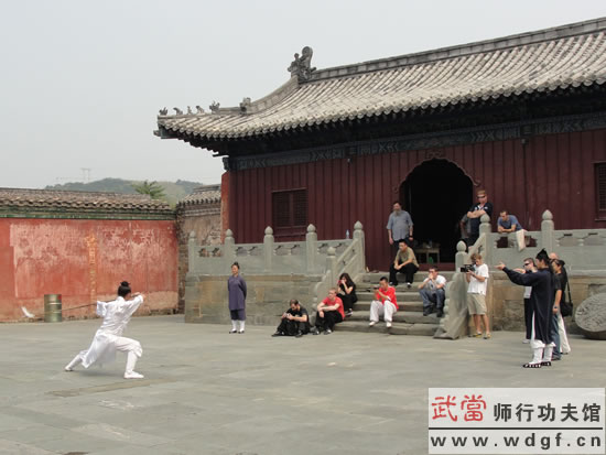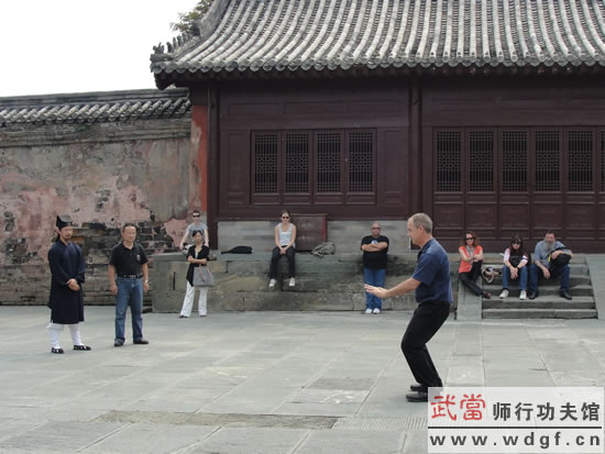交流团的师生也在现场进行了功夫表演,表达自己对中国、对武当武术独特魅力的喜爱。金发碧眼的学生,做着刚柔相济的太极动作,成为古老的元和观的一道亮丽的风景线。